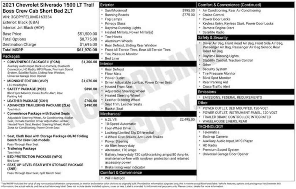 The 2021 Silverado 1500 LT Trail Boss delivers standout capability, premium comfort, and bold styling in one rugged package. Powered by a 6.2L V8 engine producing approximately 420 horsepower and 460 lb-ft of torque, paired with a 10-speed automatic transmission, it offers both strong performance and towing capability. The Trail Boss trim adds off-road ready features including a factory 2-inch suspension lift, skid plates, and aggressive styling cues, making it capable on rough terrain as well as on the road. With the Convenience 2 Package, Midnight Edition styling, Advanced Trailering tech, leather-appointed interior, and sunroof, this truck offers a full complement of premium features.Key Features & Equipment:Clean CarFaxKELLEY CERTIFIED: 12-Month / 12,000 Mile Limited Powertrain Warranty.Engine & Performance: 6.2L V8 ( 420 hp / 460 lb-ft)Transmission & Drivetrain: 10-speed automatic, 4WD, LT Trail Boss trim with factory off-road lift and skid platesExterior & Styling: Midnight Edition package (blacked-out trim elements, dark wheels or accents), LT Trail Boss design signature with bold grille and rugged lookConvenience & Premium Packages: Convenience 2 Package (adds upgraded comfort & convenience features), Advanced Trailering Package (trailering enhancements and camera systems)Interior & Comfort: Leather-appointed seating, power front seats, heated/ventilated seats, power tilt/slide sunroofTechnology & Utility: Trailering aids, multi-camera views, hitch guidance, connectivity features, and upgraded interior materialsCapability & Utility: Short bed configuration for a balance of cargo space and maneuverability; capable of heavy-duty hauling and off-road adventureKelley Automotive, every pre-owned vehicle is professionally treated with Forever New PaintGuard for only $399. This advanced protective coating creates a durable, invisible barrier that shields your vehicle's paint from UV damage, bird droppings, and environmental contaminants, helping preserve that like-new finish. Looking for complete protection? Upgrade to the Forever New Total Protection Package for just $999, which includes: PaintGuard, SoundGuard, RustGuard, LeatherGuard, FiberGuard.When you purchase a vehicle at Kelley Automotive, you'll also receive free car washes for life at any of our three convenient locations, making it easy to keep your vehicle clean and cared for year-round!Need repairs? We've got you covered. Kelley Automotive operates four professional Body Shop locations offering expert collision repair and high-quality service to keep your vehicle looking and driving its best. Experience unmatched protection, maintenance, and service all in one place. Contact your Kelley Automotive representative today to learn more about why we're your one-stop shop for all things automotive.